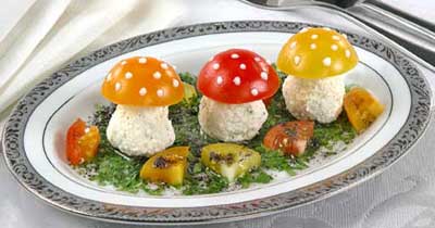 Творог разотрите с маслом, чесноком, пропущенным через пресс, и солью. Из массы сформуйте 6 конусов, хорошо охладите. Тарелку посыпьте зеленью и поставьте на нее подготовленные конусы, а на них в виде шляпок поместите половинки помидоров. Майонез нанесите крапинками на шляпки "грибов". Оставшиеся половинки помидоров нарежьте ломтиками, уложите вокруг и полейте смесью растительного масла с солью и перцем.