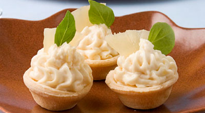 Сыр натрите на мелкой тёрке, чеснок пропустите через пресс, ананас, отложив немного для оформления, измельчите. Подготовленные ингредиенты соедините, заправьте майонезом. Выложите закуску в тарталетки, оформите кусочками ананаса.