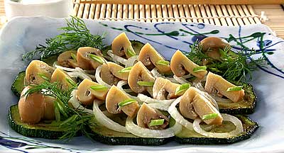 Грибы отделите от маринада и промойте. Крупные экземпляры разрежьте на 2-4 части. Кабачки очистите, нарежьте кружочками и спассеруйте на масле. Посолите, поперчите и охладите. Репчатый лук нарежьте кольцами, а зеленый нашинкуйте. Подготовленные продукты выложите на блюдо. Оформите салат зеленью. Сливки подайте отдельно.