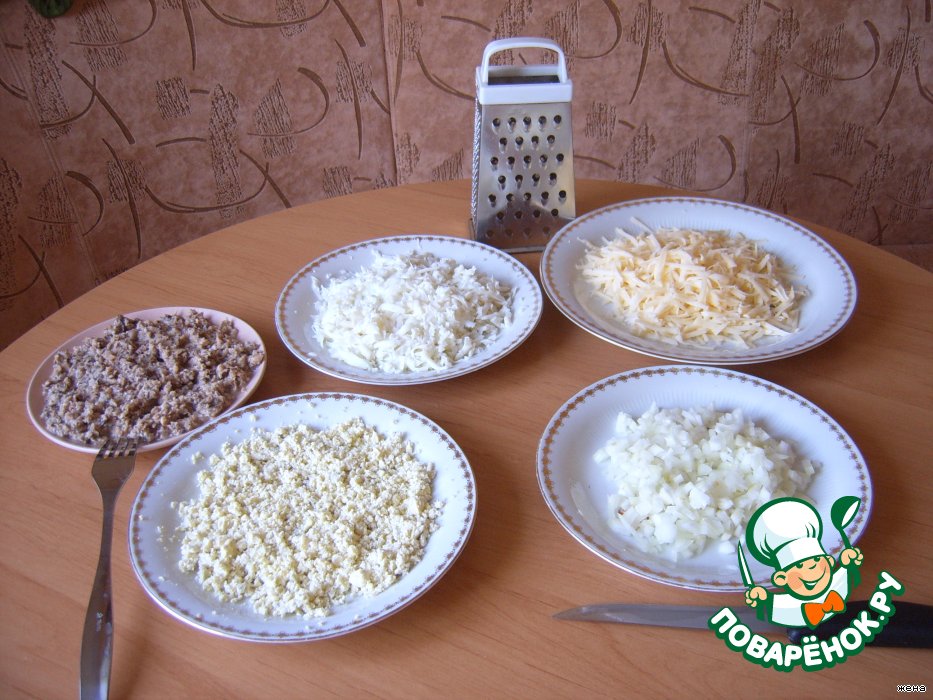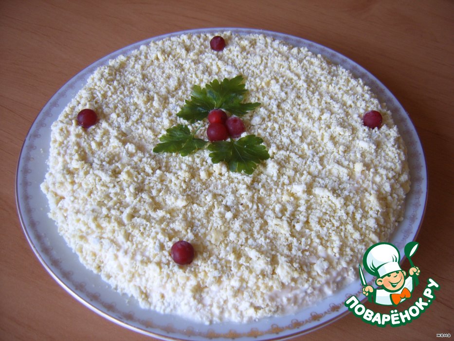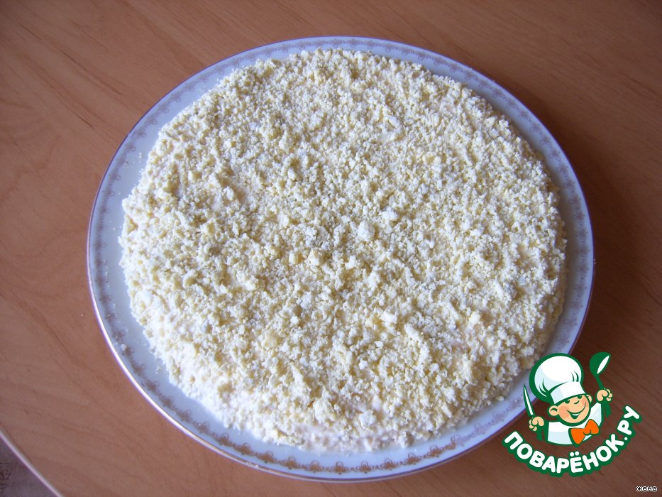 | 5 слой - сырный слой смазываем майонезом и присыпаем яичным желтком. |