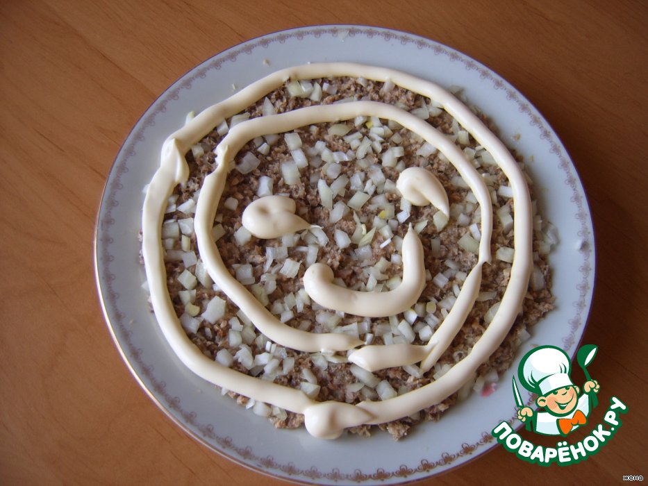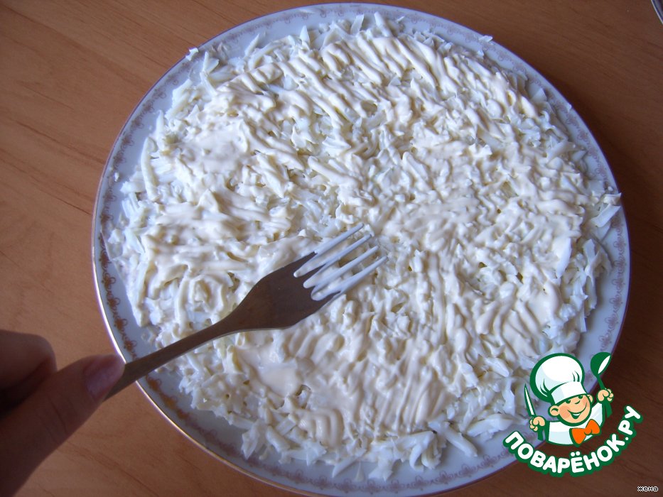 | 3 слой - яичный белок + майонез, аккуратно распределяем вилкой. |