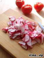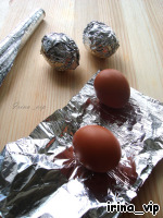 | Запечь яйца в духовке. Для этого каждое яйцо завернуть в фольгу и отправить в духовку на 1 час. Температура – 160*С. По прошествии указанного времени вынуть яйца, дать остыть, очистить и крупно нарезать. Очевидно, что запеченные яйца можно заменить варёными. |
