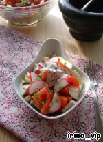 | Сметану, хрен и соевый соус смешать, заправить соусом салат. Посолить по вкусу, посыпать чёрным молотым перцем. |