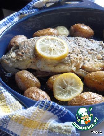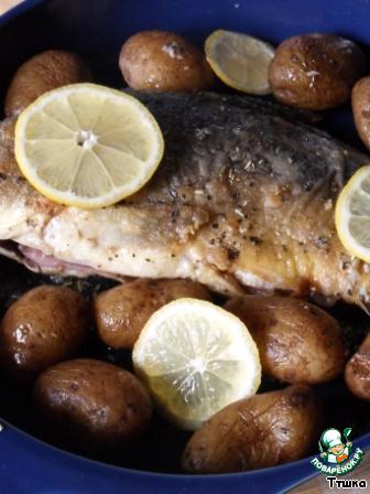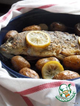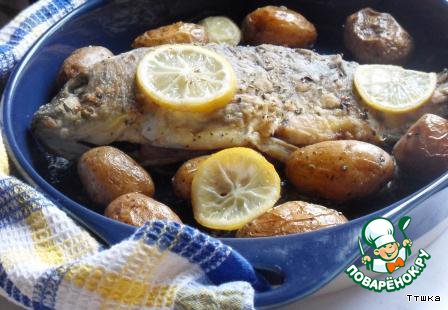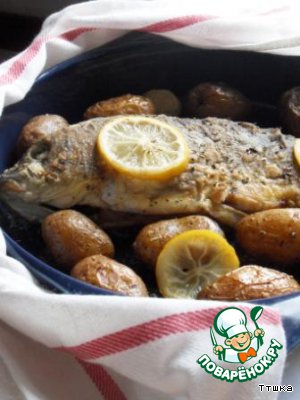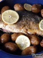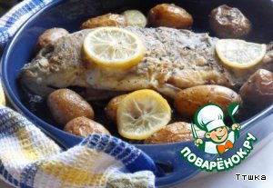 | Вокруг рыбы положить картофель и несколько кружков лимона. Поставить в разогретую до 180 градусов печь и запекать около 30-40 минут |