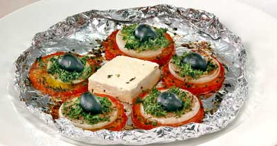 На 4 листа фольги положите по ломтику брынзы, посолите, поперчите и сбрызните оливковым маслом. Затем рядом уложите кружочки помидоров, колечки лука, маслины и зелень. Сбрызните маслом, плотно заверните пакетики и запекайте при 200 С 25 минут. Выложите пакетики на тарелки, приоткройте их, отдельно подайте пшеничный хлеб.