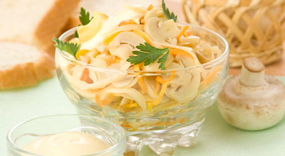 Морковь натрите и обжарьте на масле. Грибы отварите в подсоленной воде, охладите и нарежьте ломтиками. Соедините грибы с сыром, морковью и заправьте майонезом с горчицей. При подаче оформите салат зеленью петрушки.