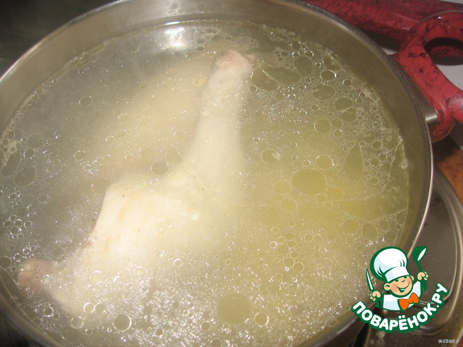 | Готовим куриный бульон. Солю всегда вначале, чтобы курочка отдала всю свою вкусность бульону. Не кладу никаких приправ (можно только пару горошин перца и 1 лаврушку, не больше). Варю около 1.5 часа. |