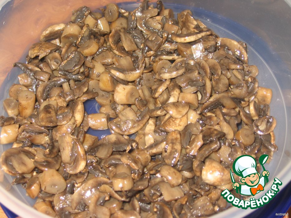 | На другой сковородке обжариваем на сливочном масле шампиньоны, порезанные тоненькими ломтиками, минут 5, потом добавляем сливки и тушим под крышкой на маленьком огне до готовности. |
